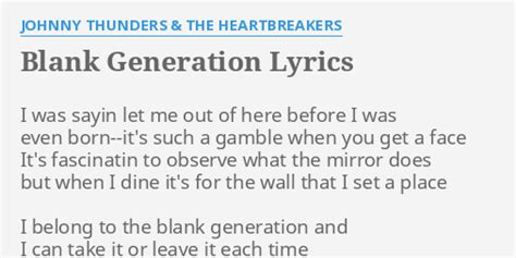 Lyrics Blank Generation. Even born, it's such a gamble when you get a face. I was sayin', let me out of here, before i was.
