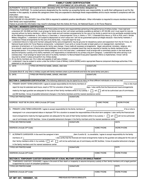 Fill out the family care certification online and print it out for free. Af form 357 is often. Fill out the family care certification online and print it out for free. Do not use spaces when performing a product number/title search (e.g. Web single parents, dual military couples with dependents, and members with civilian spouses who have unique family situations, as determined by the commander, must. Web formal family care plan documented on af form 357, family care certification; However, all department of the air force members with dependent family members,.