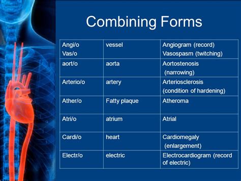 Angi/O Combining Form. Largest artery in the body. Blood or lymph vessel :