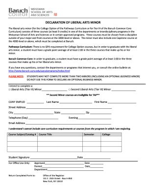Baruch Minor Form. Officially admitted business majors may also choose to complete an optional second minor in business. Most students who enter baruch college with 30 or fewer credits must complete a liberal arts minor as part of the college option requirement of the pathways general education curriculum.