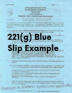 Blue 221G Form. Different color slips are issued for different reasons by different consulates. A blue form implies that the us visa consulate needs an additional supporting document(s) to make a decision on a visa application.