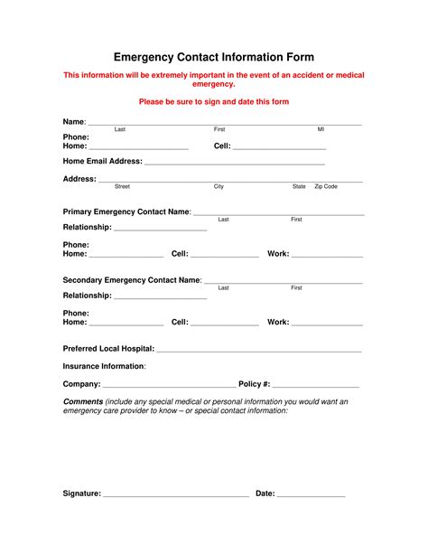 Employee signature _____ date _____ Web our emergency medical form includes spaces for personal information, medical conditions and current medications, allergies, emergency contacts, and an emergency medical authorization either. Web when children go to summer camp, parents must fill out an emergency contact form in case anything happens to one of the children. That is why it is crucial for you to complete the information in this form for each member. Creating an emergency contact information form is an easy task. An employee emergency contact form is a document that references an individual’s closest family members or friends in the event of a workplace accident or injury. Web updated april 11, 2023. Web i have voluntarily provided the above contact information and authorize _____ and its representatives to contact any of the above on my behalf in the event of an emergency.
