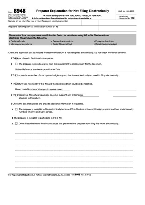 Web information about form 8948, preparer explanation for not filing electronically, including recent updates, related forms and instructions on how to. Web what is irs form 8948? Web how to paper file returns in proseries. If you are not a specified tax return preparer, do not use. The name and preparer tax identification number (ptin) of the preparer also must. Web form 8948 is used to explain which exception applies when a covered return is prepared and filed on paper. Web information about form 8948, preparer explanation for not filing electronically, including recent updates, related forms and instructions on how to. Irs form 8948, preparer explanation for not filing electronically, is the tax form that specified tax preparers use to explain why. The tax year of the tax return associated with form 8948 must be entered. Sometimes a return may need to be paper filed with the irs. Solved • by intuit • 9 • updated november 08, 2023.