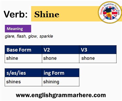 Shine V3 Form. For the meanings to glow, to be bright and to direct a light, american english favors the past. Web conjugation verb shine x english irregular verbs shine infinitive to shine preterite shone/shined past participle shone/shined.