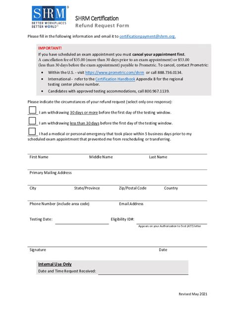 Shrm Certification Refund Request Form. Please fill in the following information and email it to certificationpayment@shrm.org.