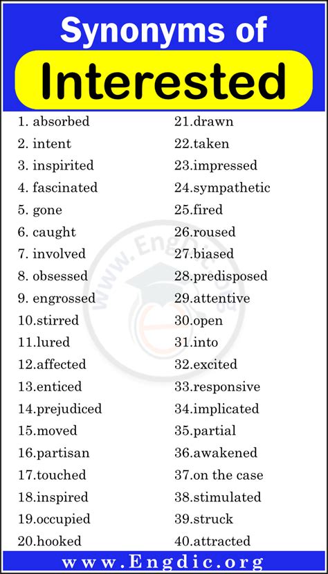 Interested Synonym List. Web find 2,389 synonyms for interested and other similar words that you can use instead based on 16 separate contexts from our thesaurus. Web 1 as in engaged synonyms & similar words relevance engaged intrigued involved enthralled focused engrossed immersed absorbed attentive intent observant rapt.