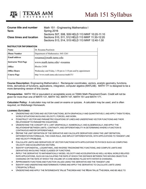 Math 151 Tamu Syllabus. Your grade will be determined.