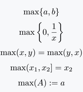 Max Symbol Math. Web your notation looks fine. You could also use the more informal $\alpha = \max(\{f(x_1),\ldots,f(x_n)\})$ or even.
