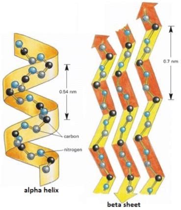 Web difference between alpha helix and beta pleated sheet shape. Oxygen atoms are colored red and nitrogen atoms colored blue. Amino acid chain is in an almost fully extended.