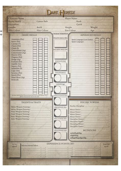 Dark Heresy Character Sheet. Web character sheet also available for download at www.fantasyflightgames.com we a p o n sk i l l (ws) ballisti c skli l (bs) st r e n g t.