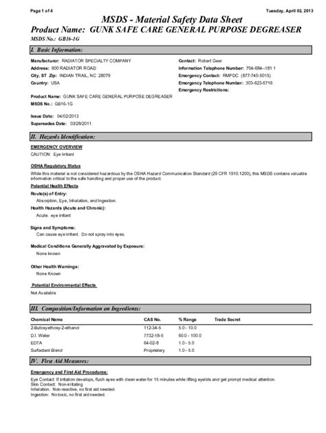 Degreaser Safety Data Sheet. Health injuries are not known or expected under normal use.