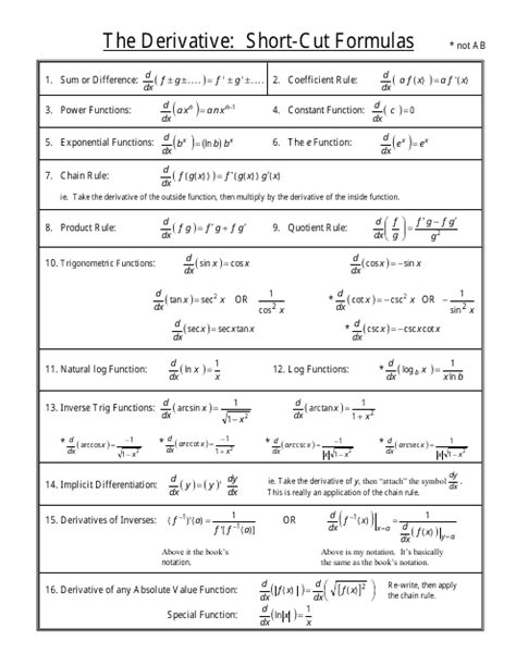 Where c is a constant 2. Web derivative shortcuts the basic three: • we use f(x) (capital) to represent the family of antiderivatives of a function f(x) (lower case). D dx (xn) = nxn 1 3. F g 0 = f0g 0fg g2 5. Type f (x) f '(x) text section power xp pxp−1 3.1 exponential bx ln(b)⋅bx 3.1 exponential (special case) ekx kekx 3.1 trig sin(x) cos(x) 3.4 trig cos(x) −sin(x) 3.4 the five ways:. Where c is a constant 2. C are constants, with b > 0. Web derivative and antiderivative shortcuts notes: (fg)0 = f0g +fg0 4. Similarly for in this table, and • a, b, c, g and h.
