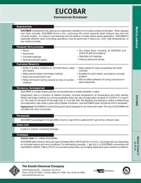 Eucobar Data Sheet. Web eucobar is a water based polymer concentrate that is readily dilutable in water. Shelf life is 2 years in original, unopened.
