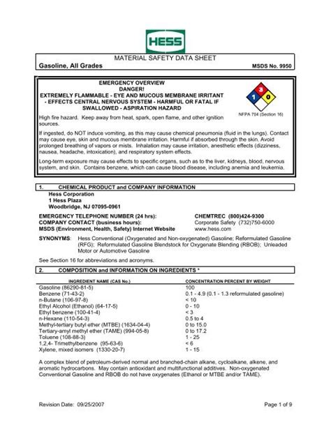 Gasoline all grades sds no. Web msds (environment, health, safety) internet website www.hess.com. Gasoline all grades sds no. Unleaded gasoline, regular gasoline, motor fuel, 85 octane gasoline, 87 octane gasoline. Reformulated gasoline blendstock for oxygenate.
