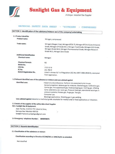 Nitrogen Gas Safety Data Sheet. N2 chemical family inorganic, gas product.