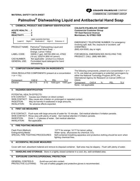 Palmolive Dish Soap Safety Data Sheet. Palmolive ultra dishwashing hand liquid original product code material :.