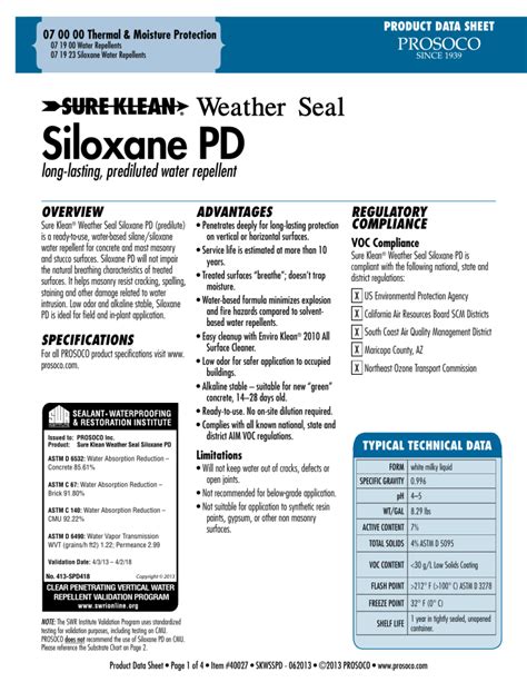 Shelf life 1 year in tightly sealed, unopened container; Voc content 350 g/l maximum reactive penetrating sealer; Siloxane pd will not impair the natural. Web siloxane pd helps masonry resist cracking, spalling, staining and other damage related to water intrusion. Form clear, slightly yellow liquid;