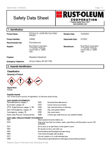 Hazards identification classification symbol(s) of product signal word danger possible hazards 3% of the mixture consists of ingredient(s) of unknown acute toxicity. Hazards identification classification symbol(s) of product signal word danger ghs hazard statements flammable. Therefore make sure to come back and. Web safety data sheet trusted quality since 1921 * www.rustoleum.com identification 2. Web safety data sheet 1. Please select the product below for up to date product and safety datasheets. Material safety data sheets are updated on a regular basis. Hazards identification classification symbol(s) of product signal word danger.