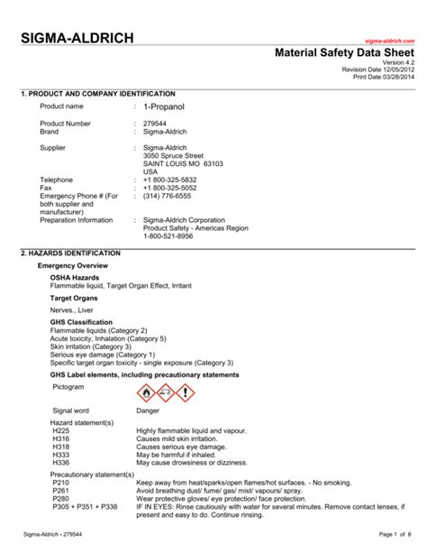 Safety Data Sheet For Propanol. Identification of the substance/mixture and of the company/undertaking product. Web pictogram signal word danger hazard statement(s) h225 h319 h336 highly flammable liquid and vapor.