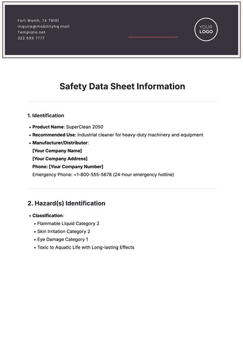Safety Data Sheet Template. Identification of the substance/preparation and of the company/undertaking. The pi or manager must generate a globally harmonized system (ghs).