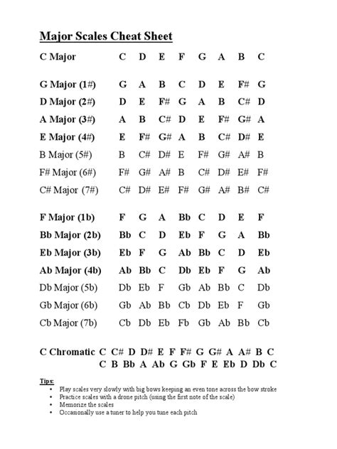 Scales Cheat Sheet. It shows how each scale is built, what notes. Practice scales with a drone pitch (using the first note of the scale) memorize the.