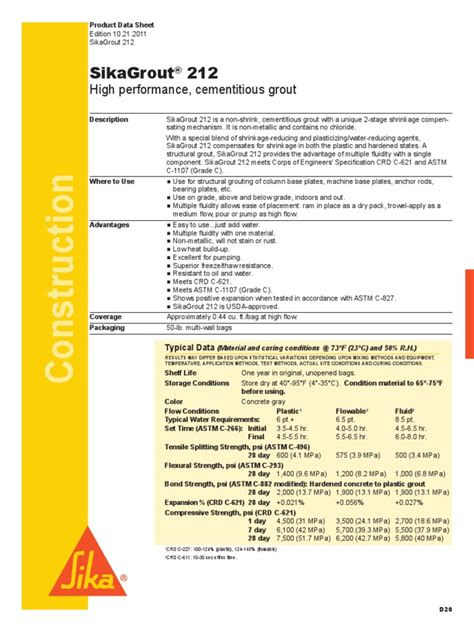 Sika 212 Data Sheet. 13 l (0.46 ft3) per bag of fluid grout. Packaging 25 kg (55 lb) bag colour concrete grey.