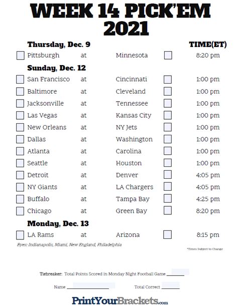 Week 14 Nfl Pick Em Sheet Printable The Printable Sheet Will Be Updated