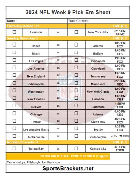 Week 9 Pick Em Sheet. Nfl football week nine picks and schedules. Web print week 9 nfl pick'em office pool sheets in.pdf format.