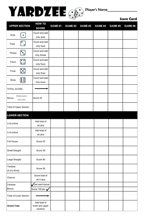 Printable Yahtzee Score Card for YARD YAHTZEE • Whipperberry
