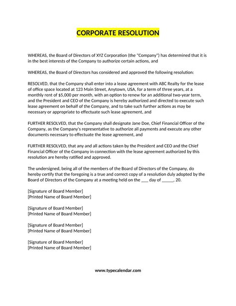 Corp Resolution Template. Download your free corporate resolution. Web our free template for a corporate resolution includes space for the following information: