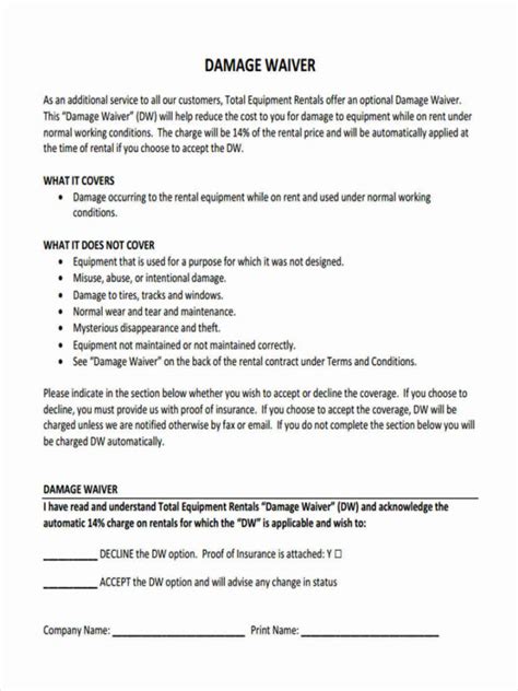 Damage Waiver Template. Damage waiver form in pdf.