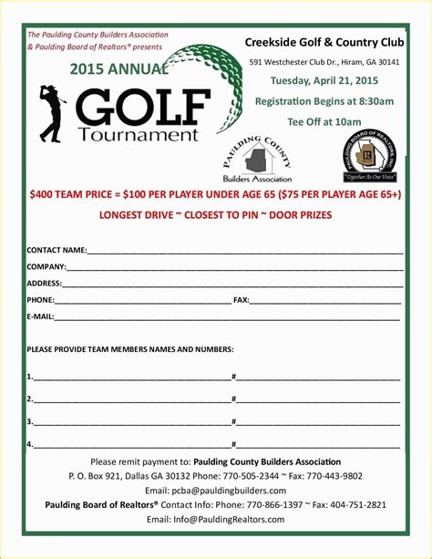 This editable golf tournament registration form template provides all the information you need to get you and your attendees. By creating an online form with forms.app's free templates; Web cloned 1,304 a golf tournament registration form is a form that allows participants to register for a golf tournament, and sponsors to register as well. You can register for golf events. Golf tournament registration forms are often used as a way. Web download free printable sports registration form templates action indoor sports registration form 214 kb 1 file (s) 2 downloads download adult sports registration form 55 kb 1 file (s) 3.