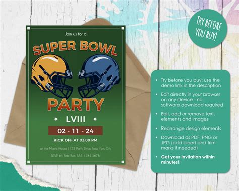 Have you already chosen your super bowl. 8 templates white green minimalist poster vegan. Have you already chosen your super bowl. This is the perfect invitation for your next super bowl party. Web open the file and print. Enter the number of copies you need and set scale to 24.5%. Check out our super bowl invitations. Web browse through our extensive collection of free super bowl invitations. Web superbowl templates browse our free templates for superbowl designs you can easily customize and share. Web football birthday invitation, football phone invitation, customizable football birthday invitation, editable super bowl invitation.