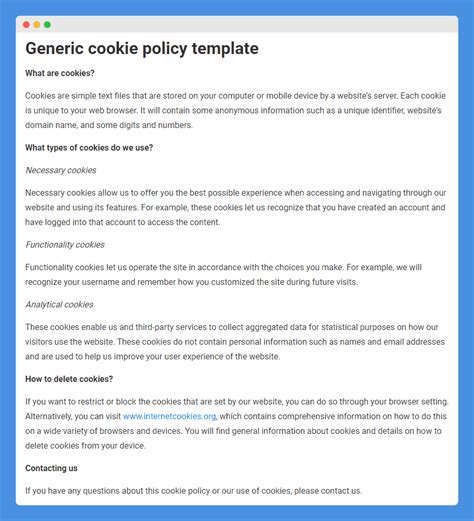 Web access the template: Generate cookie policy in minutes;. Web free cookie policy template from cookieyes. Web free sample cookie policy template july 19, 2023 by olivia adams 4 min read we have already discussed the cookie policy guide. Web a cookie policy is a document that provides a comprehensive list of the cookies and trackers used on a website,. Download the free cookie policy template from [your company’s website] or other. Gdpr, ccpa compliant free tool;