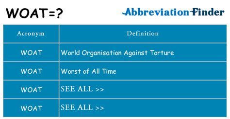 Showing only slang/internet slang definitions ( show all 2 definitions) new search. Worst of all time (concept) worst of all time; Also seen as omct) woat: Of all time | whale of a time | world organisation against torture | worst of all timeåê « first ‹ previous next › last » what is woat? World organisation against torture (geneva, switzerland; Woat is an acronym, abbreviation or slang word that is explained above where the woat definition Web the definition of woat is worst of all time the meaning of woat: Web woat stands for : If somebody tries to limit your independence then they will most likely be kicked. Not many people can claim to be the g.o.a.t., but those who can. Web name woat meaning having freedom of choice is a source of joy to anyone who has this name.