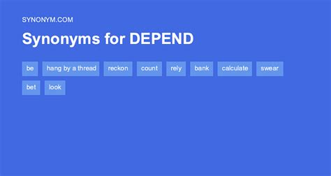 Another Word For Depend. Rests, turns, rides, stays, hinges, hangs, establishes, grounds; Trust in, bank on, count on, lean on, reckon on, rely upon, turn to, be determined by, be based on, be contingent on,.