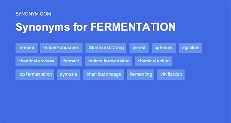 Another Word For Fermentation. Turmoil, ferment, unrest, tension, excitement, confusion, anxiety, restlessness;. The state of rising by fermentation.