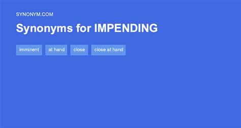 Web find 1,519 synonyms for impending and other similar words that you can use instead based on 8 separate contexts from our thesaurus. Loom, brew, approach, threaten, hover, menace, draw on, near; Diminish, disappear, recede, fall, vanish, abate, lessen, decline These are words and phrases related to impending. Web compare synonyms on this page you'll find 58 synonyms, antonyms, and words related to impending, such as: Approaching, brewing, imminent, looming, coming, and gathering. Click on any word or phrase to go to its thesaurus page. Upcoming, approaching, coming, imminent, nearing, to come, oncoming, forthcoming;