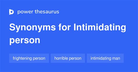 Another Word For Intimidating Person. Words related to intimidating are not direct synonyms, but are. Terrifying, frightening, formidable, scary, horrible, terrible, alarming, fearful;