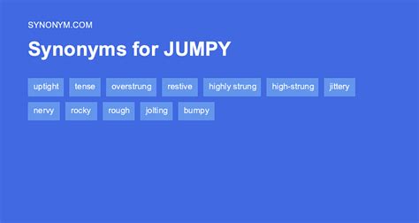 Excitable, nervous, unstable, anxious, hyper, volatile, jittery, hyperactive; Web find 2,570 synonyms for jumpy and other similar words that you can use instead based on 7 separate contexts from our thesaurus. Web explore 'jumpy' in the dictionary. Web find 28 different ways to say jumpy, along with antonyms, related words, and example sentences at thesaurus.com. (adjective) in the sense of nervous.