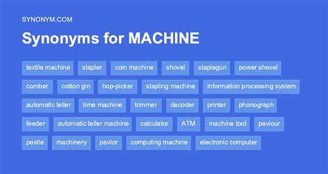 Web find 1,671 synonyms for machine and other similar words that you can use instead based on 15 separate contexts from our thesaurus. Engine, motor, converter, equipment, mechanism, tool, mill, appliance; Engines, motors, converters, mechanisms, appliances, tools, equipments, mills; Quit, drop, abandon, discontinue, desert, forsake. Web synonyms and antonyms of machine in english machine noun these are words and phrases related to machine. Web find 38 different ways to say machine, along with antonyms, related words, and example sentences at thesaurus.com.