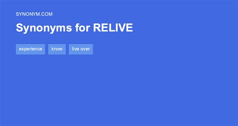 Another Word For Relive. Web on this page you'll find 97 synonyms, antonyms, and words related to relive, such as: Remember, reminisce, see, reflect, imagine, ponder, contemplate, dream, visualize, envision.