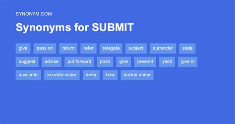 Another Word For Submit. Web find 70 synonyms and antonyms of submit, a verb meaning to give way to someone or something that one can no longer resist. Web find 3,316 synonyms for submit and other similar words that you can use instead based on 18 separate contexts from our thesaurus.