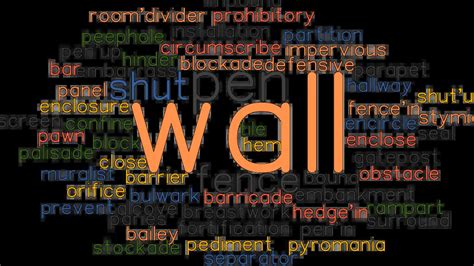 Web find 1,562 synonyms for wall and other similar words that you can use instead based on 14 separate contexts from our thesaurus. Fence, barrier, barricade, obstacle, hedge, block, chain, bumper; Fences, barriers, barricades, obstacles, hedges, blocks, chains, hurdles;