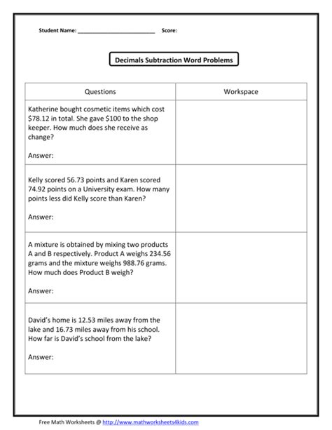 Decimals Subtraction Word Problems