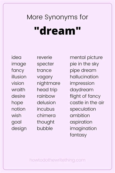 Daydream, illusion, fantasy, vision, delusion, phantasy, nightmare, idea; Web find 97 different ways to say dreams, along with antonyms, related words, and example sentences at thesaurus.com. Web find 6,457 synonyms for dream and other similar words that you can use instead based on 32 separate contexts from our thesaurus. Web synonyms of 'dream' in british english dream explore 'dream' in the dictionary dream 1 (noun) in the sense of.