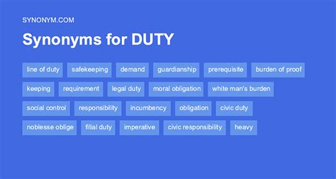 Web find 2,896 synonyms for duty and other similar words that you can use instead based on 16 separate contexts from our thesaurus. Tax, levy, tariff, imposition, impost, excise, assessment, income tax; Web on this page you'll find 206 synonyms, antonyms, and words related to duty, such as: Taxes, tariffs, levies, impositions, imposts, assessments, excises, customs;