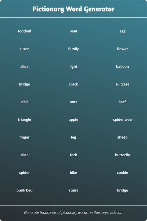 Random Pictionary Word. Jump down to the generator. It can be difficult to arbitrarily come up with good words to use in your.