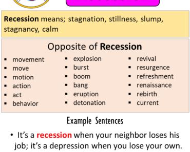 Recession Opposite Word. Slump, depression, panic, downturn, stagnation, slowdown, crash, bust; Web find 22 different ways to say recession, along with antonyms, related words, and example sentences at thesaurus.com.