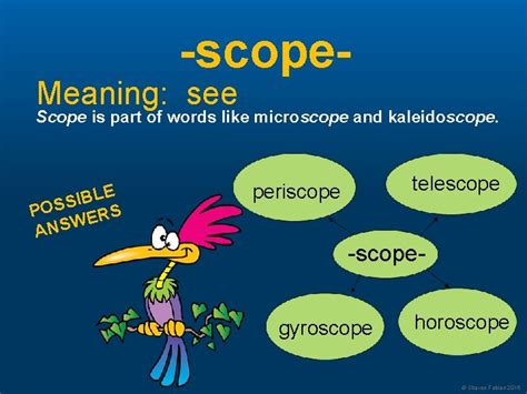Root Word Of Scope. The range of a supersonic jet spectroscope. An area in which something acts or operates or has power or control: